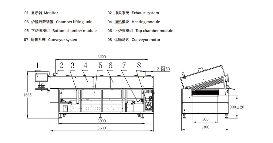 | 1.可選:機(jī)頭機(jī)尾可凸出,凸出上爐膛外側(cè)面尺寸300mm(整機(jī)尺寸會加長600mm)。 2.注明:根據(jù)產(chǎn)能要求,推薦溫區(qū)數(shù)量優(yōu)先選擇:4溫區(qū)、5溫區(qū)、 8溫區(qū)、9溫區(qū)、10溫區(qū)、12溫區(qū),可定制。 | |||