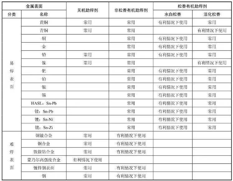 ②有利條件下使用:在表面無(wú)嚴(yán)重的銹膜或類似的污染時(shí),可用水白松香助焊劑。通常這類金屬表面可用活化松香或非松香有機(jī)材料助焊劑進(jìn)行焊接。